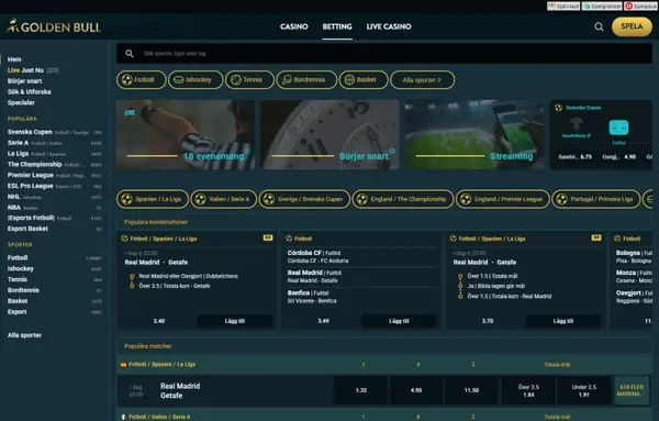 Din sportsbook och ditt casino delar ett och samma konto med ett SEK-saldo hos Goldenbull â inga överföringar behövs. Vi tĂ€cker ett brett utbud av sporter, och den fullstĂ€ndiga listan anpassas efter sĂ€song och evenemangskalender. Vanliga marknadstyper inkluderar matchresultat, totalmĂ„l (över/under) och handikapp, med ytterligare alternativ beroende pĂ„ sporten. Förmatchsbetting och live betting Ă€r bĂ„da tillgĂ€ngliga, med liveoddsen som uppdateras i realtid under matchens gĂ„ng.
