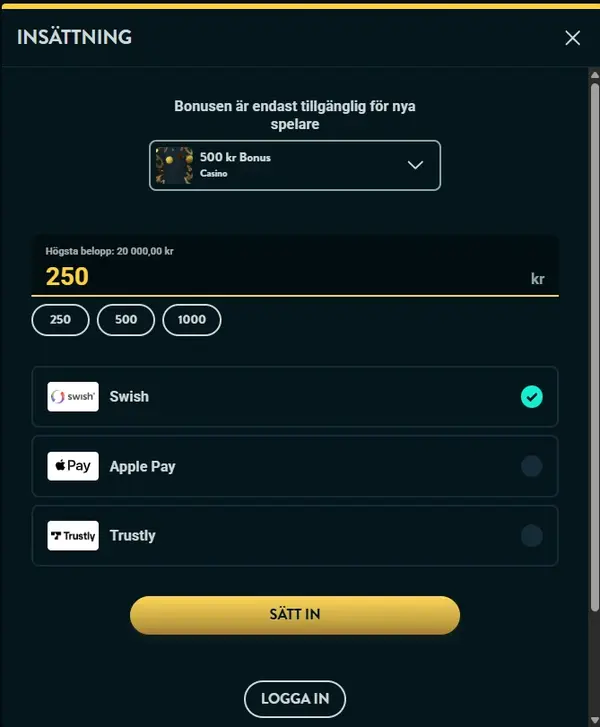 | Betalningsmetoder | InsĂ€ttningar: Swish, Trustly, Apple Pay â Uttag: Swish, Trustly |